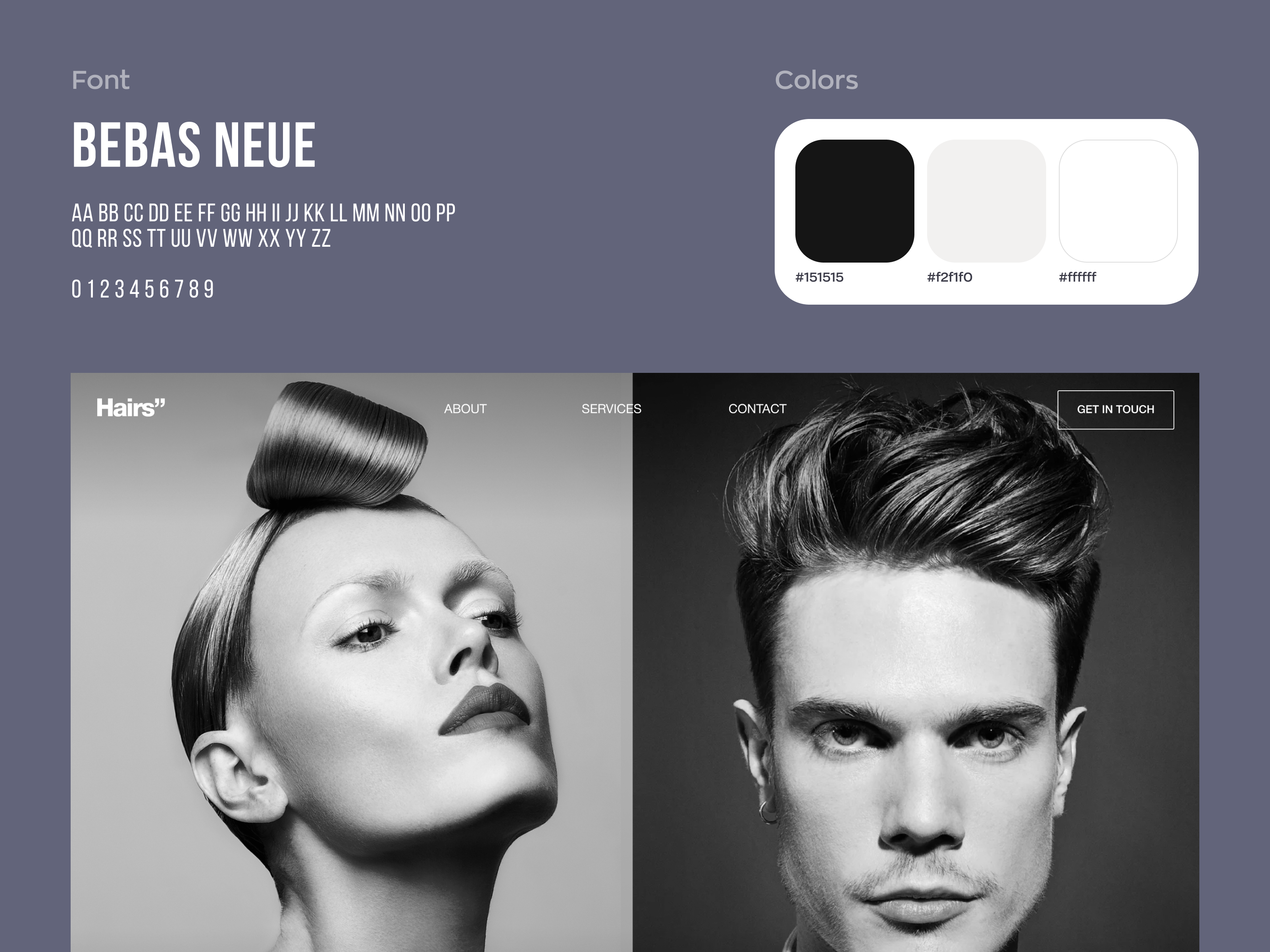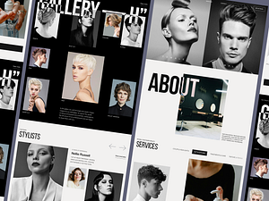 The hero page features captivating haircut photos for men and women, a company philosophy, a service selection carousel, a booking option, a hairstyle gallery, a team section, testimonials, and a booking form.