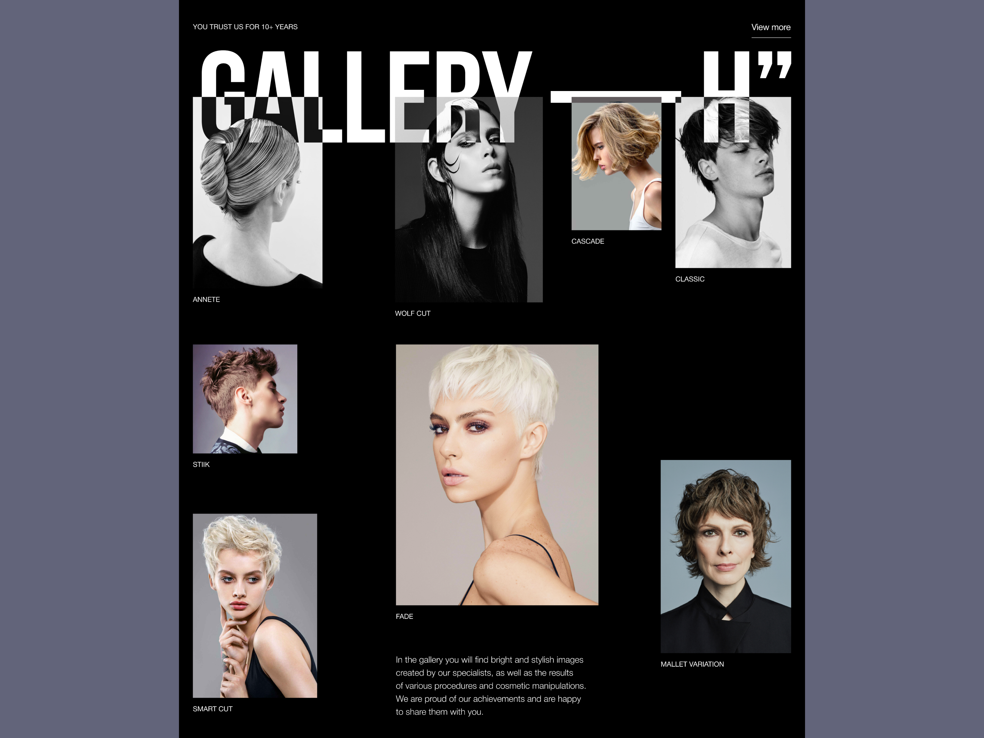 The primary characteristic of this design is its stylish presentation with minimal text, focusing on showcasing the impressive work of the hairstylists efficiently.
